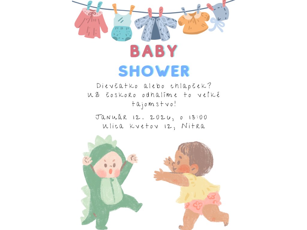 Štýlová a hravá pozvánka na baby shower, ktorá poteší každú budúcu mamičku aj hostí. Dizajn kombinuje jemné pastelové farby, detské oblečenie zavesené na šnúrke a ilustrované postavičky detí, čo jej dodáva láskyplnú a radostnú atmosféru. Obsahuje všetky dôležité informácie o udalosti – dátum, čas, miesto a tematickú otázku, či sa čaká dievčatko alebo chlapček.