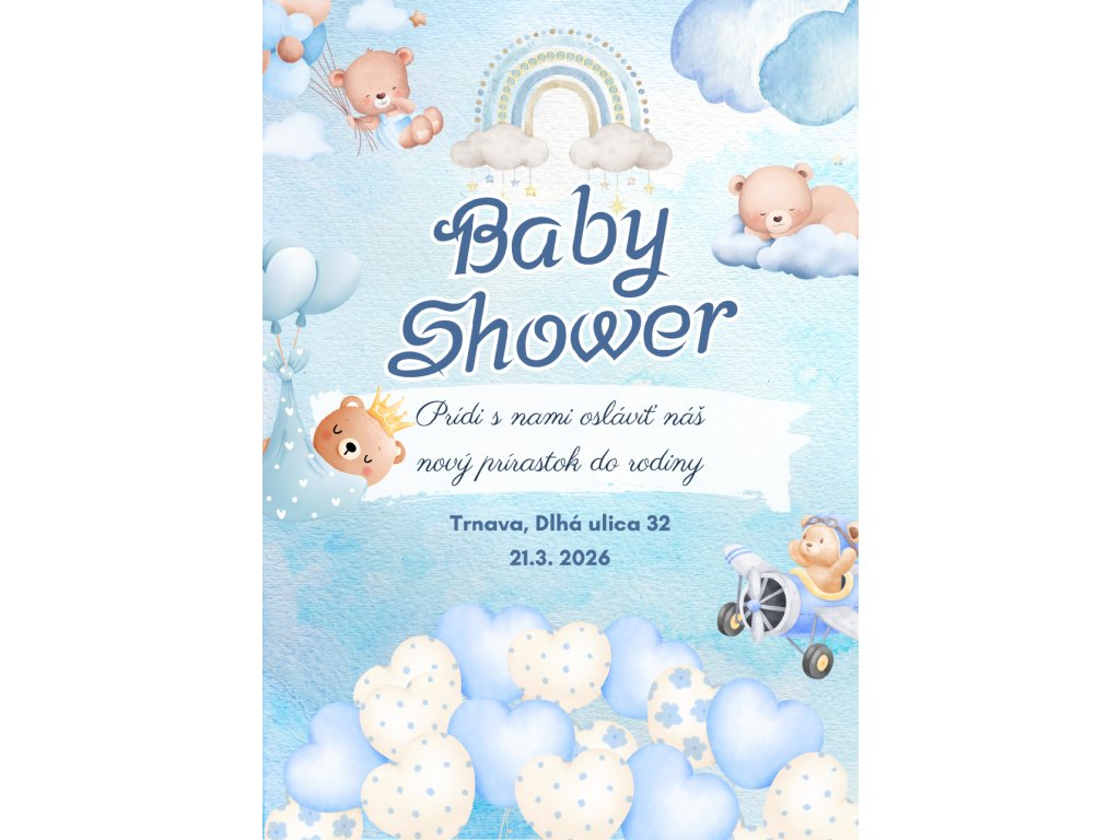 Nežná Baby Shower pozvánka, na ktorej sa macko necháva unášať veľkým balónom ponad hebké modré obláčiky. Malé lietadielko v pozadí dodáva scéne hravý nádych a pocit dobrodružstva. Jemné nebeské tóny vytvárajú upokojujúcu atmosféru, ideálnu na oslavu blížiaceho sa príchodu bábätka.