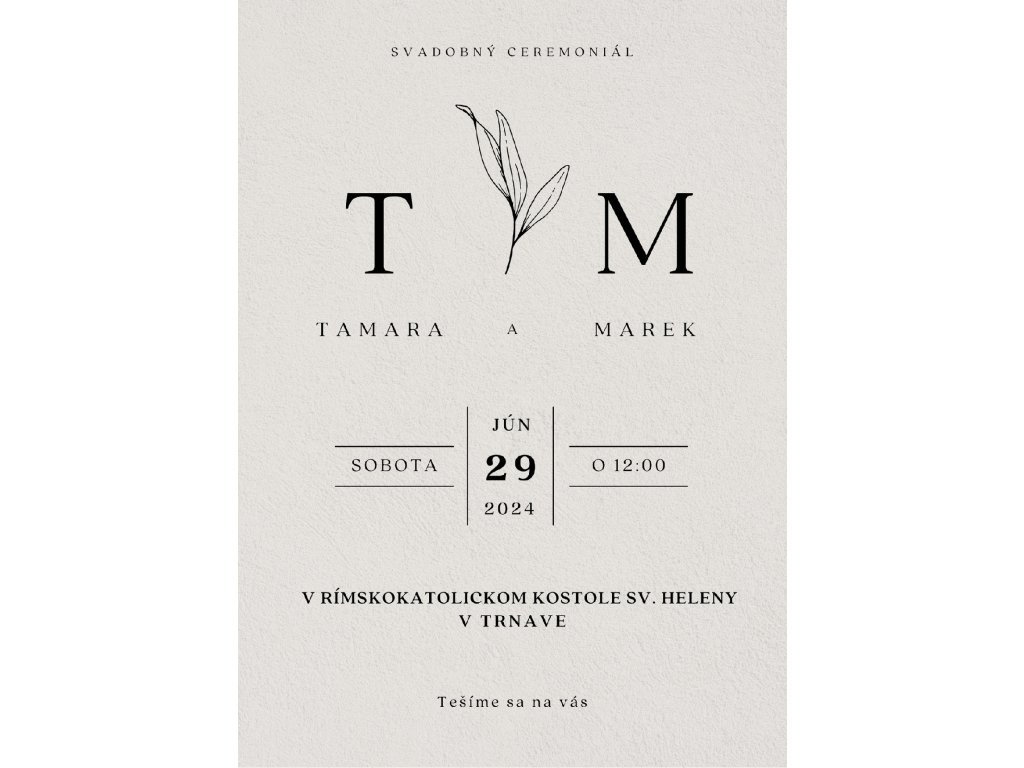 Toto svadobné oznámenie zaujme svojím minimalistickým dizajnom, kde dominuje jemné tmavo biele pozadie. Čierne písmo vytvára kontrast, ktorý je zároveň štýlový a ľahko čitateľný, čo podčiarkuje jednoduchú krásu celku. Ideálne pre páry, ktoré preferujú nadčasovú eleganciu bez zbytočných ozdôb. Minimalizmus tu znamená sofistikovanosť a čistotu v každom detaile.
