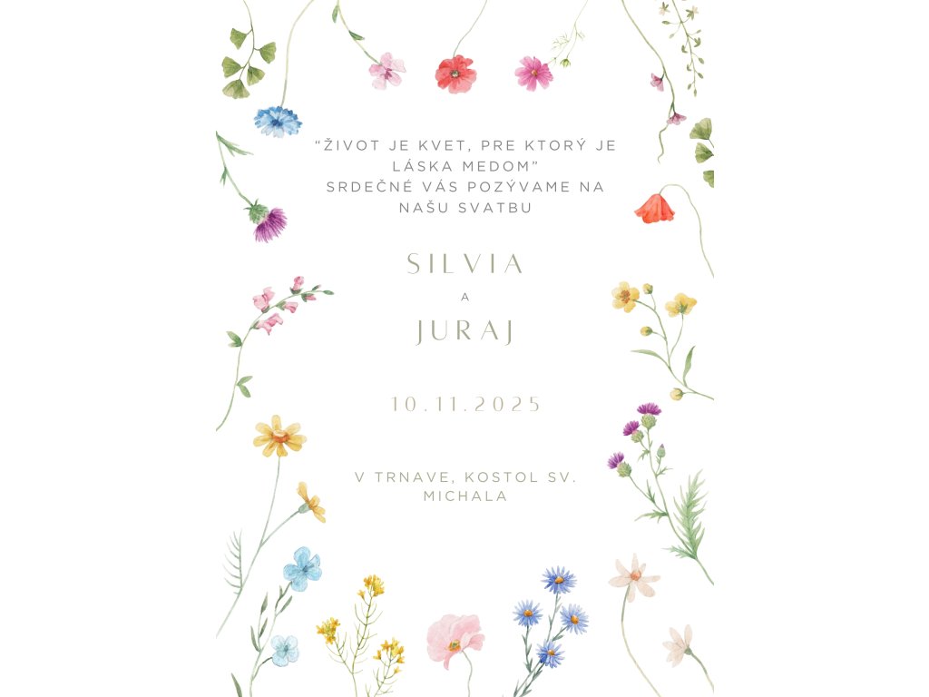 Jemné svadobné oznámenie s bielym pozadím zdobia drobné farebné lúčne kvety, ktoré lemujú okraje a nenápadne smerujú k textu ako k srdcu celej kompozície. Ich prirodzená rozmanitosť pôsobí sviežo, romanticky a zároveň decentne. Dizajn vytvára pocit voľnosti, jemného vánku a radosti z malých detailov. Ideálne pre svadbu s ľahkou, prírodnou atmosférou.
