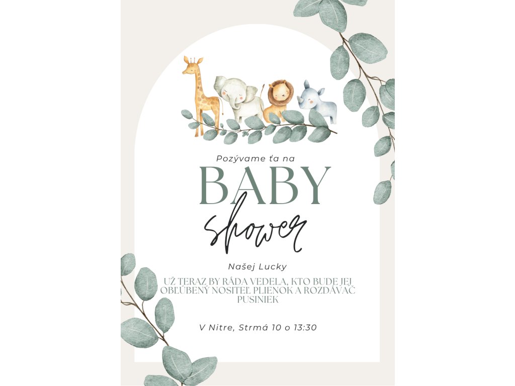 Táto štýlová Baby Shower pozvánka vás zavedie priamo do srdca rozprávkovej džungle. Roztomilé zvieratká – lev, žirafa, slon a nosorožec – rozveseľujú tmavší podklad pozvánky a dodávajú jej hravý, ale zároveň elegantný vzhľad. Jemné zelené lístky po bokoch vytvárajú harmonický rámček, vďaka ktorému pozvánka pôsobí prírodne a moderne zároveň. Ideálna voľba pre mamičku, ktorá miluje štýl, prírodu a trošku exotiky.