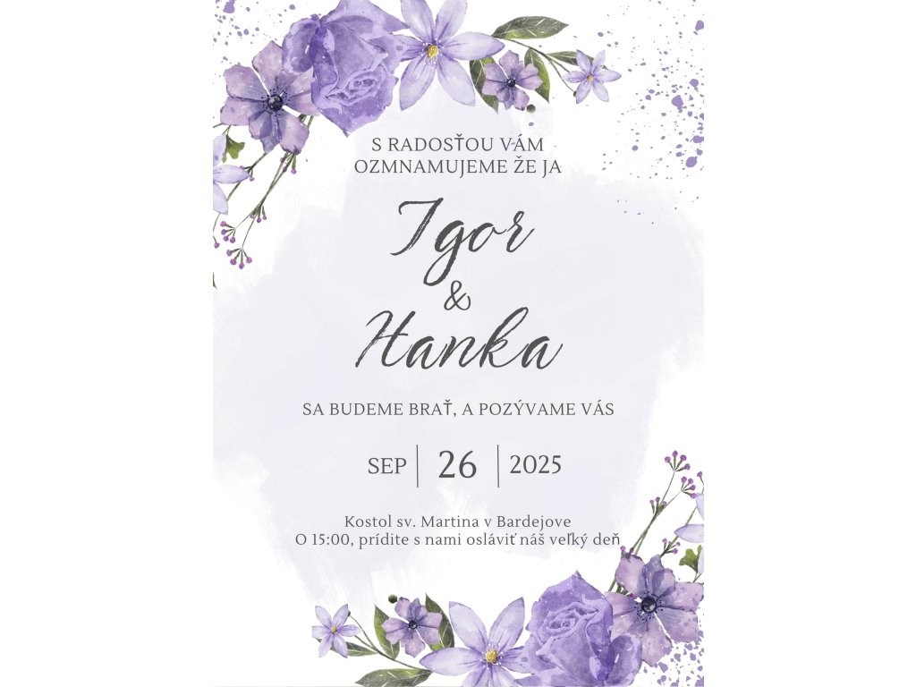 Oznámenie Fialový kvet je ideálnou voľbou pre páry, ktoré hľadajú čistý a elegantný dizajn so štýlovým farebným akcentom. Spojenie bieleho základu a kvetinového detailu vytvára harmonický dojem romantiky a vkusu.