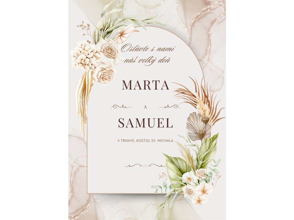 Toto svadobné oznámenie s krémovým pozadím vyniká jemnými trblietavými líniami, ktoré mu dodávajú luxusný a sofistikovaný vzhľad. Nežné krémové kvety zdobia dizajn a vytvárajú pocit jemnosti a elegancie. Oznámenie je ideálne pre páry, ktoré chcú svoj veľký deň oznámiť štýlovo a s noblesou. Každý detail je premyslený tak, aby vyvolal príjemnú a ušľachtilú atmosféru.