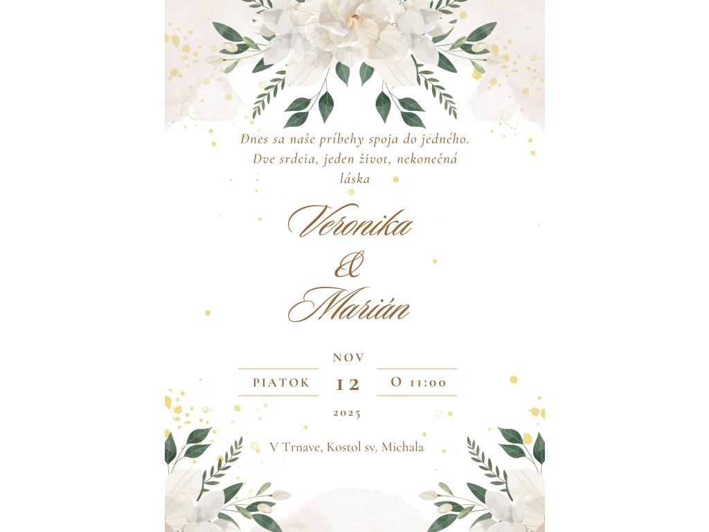 Elegantné svadobné oznámenie zdobia veľké biele kvety umiestnené v hornej a dolnej časti, ktoré pôsobia čisto a romanticky. Biele pozadie dodáva dizajnu ľahkosť a umožňuje vyniknúť jemným zlatým bodkám roztrúseným ako záblesky radosti. Všetko spolu vytvára harmonický a noblesný vzhľad, ktorý očarí už na prvý pohľad. Skvelá voľba pre páry, ktoré hľadajú kombináciu nežnosti a jemného lesku.