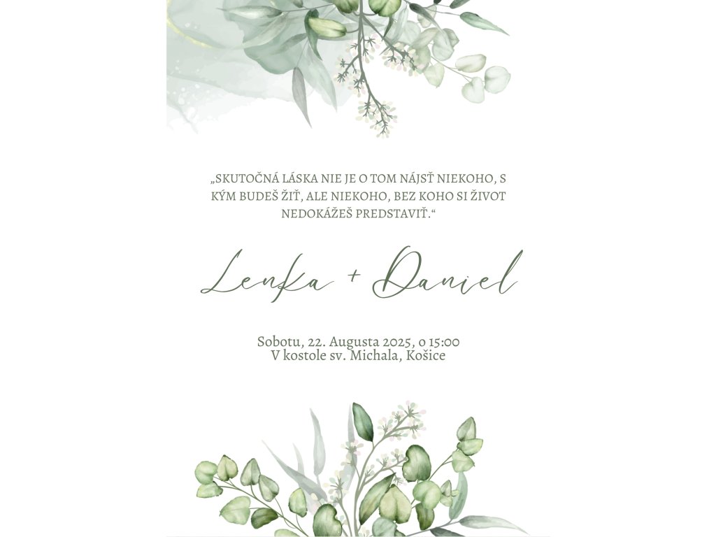 Toto svadobné oznámenie vyniká svojou jemnou zelenou farbou, ktorá evokuje prírodnú sviežosť a harmóniu. Na pozadí sa ticho rozprestierajú zelené kvietky, pripomínajúce nežnú lúčnu burinu, ktorá dodáva dizajnu autentický a rustikálny nádych. Zelené písmo perfektne ladí s pozadím a vytvára dojem prírodného spojenia a pokoja. Ideálne pre páry, ktoré túžia po svadbe s dotykom prírody a zároveň eleganciou.