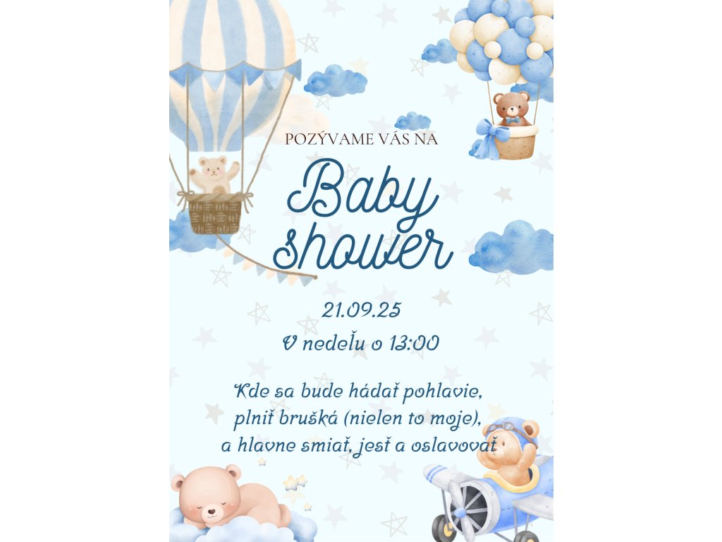 Táto rozkošná Baby Shower pozvánka vás zavedie do sveta detskej fantázie, kde macko letí na veľkom balóne ponad jemné modré obláčiky. V diaľke sa vznáša malé lietadielko, ktoré dodáva dizajnu hravosť a pocit dobrodružstva. Pozadie v odtieňoch neba pôsobí nežne a pokojne, vďaka čomu je pozvánka ideálna pre oslavu očakávaného príchodu chlapčeka.