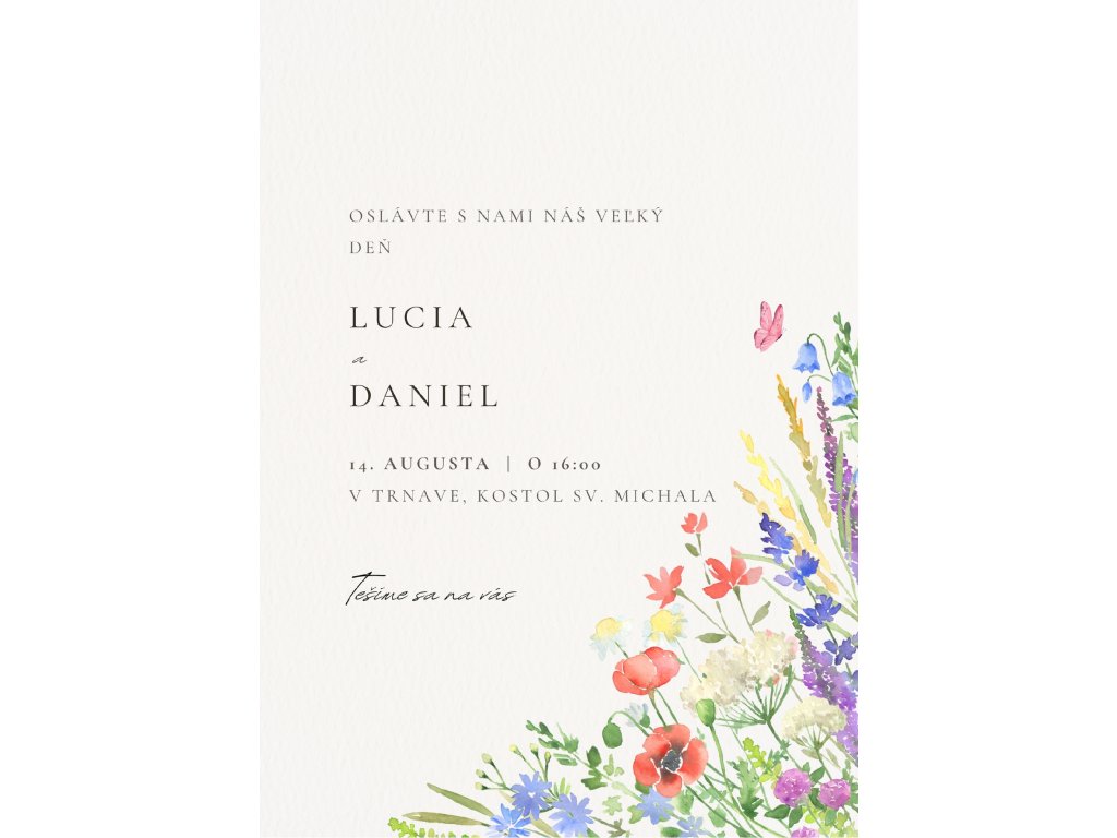 Toto svadobné oznámenie v jednoduchom a čistom dizajne s jemne tmavším bielym pozadím prináša svieži a prirodzený pocit. Lúčne kvietky v pravom dolnom rohu dodávajú nevtieravý, ale očarujúci detail, ktorý podčiarkuje jeho jemnosť. Minimalistický text dopĺňa celkový štýl, ktorý je ideálny pre páry preferujúce jednoduchosť a prírodnú eleganciu. Výsledkom je moderné a zároveň nadčasové oznámenie, ktoré zanechá krásny dojem.