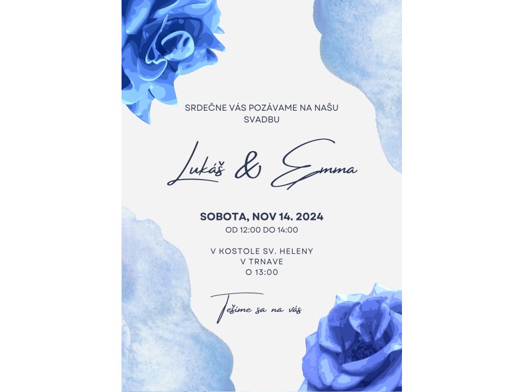 Toto svadobné oznámenie vyniká dvoma veľkými modrými ružami umiestnenými v rohoch, ktoré mu dodávajú noblesný a štýlový charakter. Elegantné modré tvary v druhých rohoch ladia s jemným, sofistikovaným písmom, ktoré dokonale podčiarkuje celkový dizajn. Kombinácia farieb a tvarov vytvára harmonický a vyvážený vzhľad, ideálny pre páry, ktoré hľadajú spojenie tradície a modernosti. Oznámenie vyžaruje pokoj a noblesu, ktorá skvele vystihuje výnimočnosť vášho veľkého dňa.