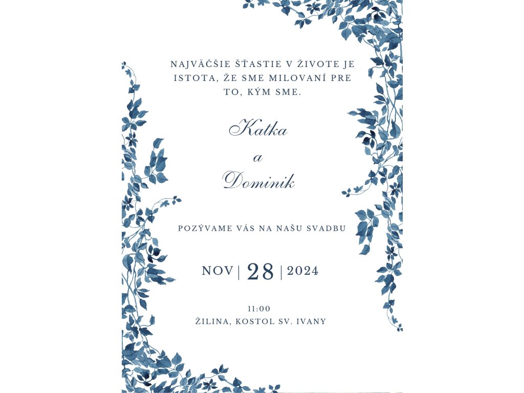 Toto svadobné oznámenie zaujme elegantným rámovaním z jemných modrých lístkov a vetvičiek, ktoré pôsobia ako romantický vinič. Na bielom pozadí krásne vyniká klasické a čisté typografické spracovanie s dôrazom na mená snúbencov a dátum svadby. Celý dizajn pôsobí vzdušne, no zároveň dôstojne – ideálny pre páry, ktoré túžia po štýlovom a decentnom oznámení. Každý detail podporuje atmosféru noblesy a jemnej prírodnej krásy.