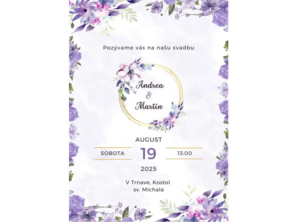 Toto oznámenie zaujme bohatou kompozíciou výrazných fialových kvetov, ktoré rámujú text a dodávajú mu elegantný a romantický výraz. Jemne fialkasté pozadie dotvára harmonický dojem a zároveň necháva text krásne vyniknúť. Výrazná farebnosť pôsobí moderne, no stále s dávkou jemnosti a noblesy. Ideálna voľba pre páry, ktoré chcú zaujať a milujú sofistikované odtiene fialovej.