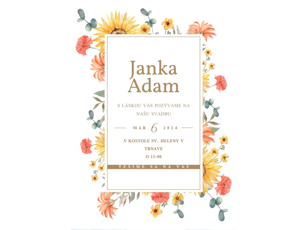 Toto svadobné oznámenie zaujme kvetinovým rámom, ktorý obkolesuje text a vytvára harmonický celok plný prírodnej krásy. Dominantné dve slnečnice dodávajú dizajnu sviežosť a veselú energiu, ktorá symbolizuje radosť a svetlo vo vašom veľkom dni. Celkový vzhľad je elegantný a zároveň hravý, ideálny pre páry, ktoré milujú kvetinové motívy s nádychom originality. Každý detail podporuje pocit blízkosti prírody a pozitívnej nálady.