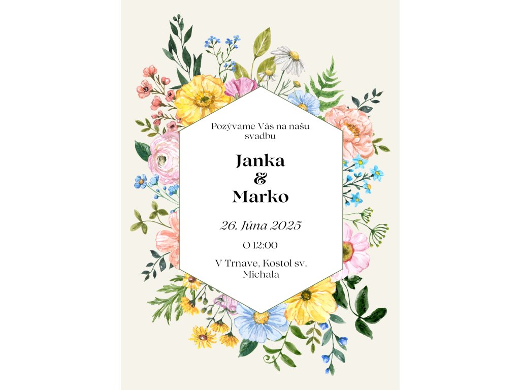 Toto svadobné oznámenie pôsobí ako malý umelecký kúsok. V jeho strede sa nachádza elegantný rám v tvare [ovál/kruh/štít – doplň podľa dizajnu], ktorý nesie vaše mená a dátum svadby. Z jeho okrajov sa jemne rozbiehajú nežné kvety, ktoré sa rozprestierajú až k hranám oznámenia a vytvárajú pocit harmónie a romantiky. Kombinácia ladného tvaru a kvetinových motívov dodáva oznámeniu výnimočný a nezabudnuteľný vzhľad, vďaka ktorému vaši hostia pocítia atmosféru blížiaceho sa veľkého dňa už pri prvom pohľade.