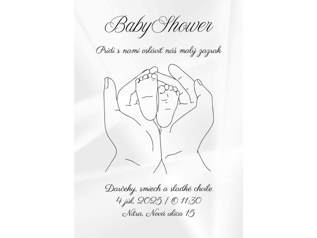 Jemné, elegantné a nadčasové – také je toto baby shower pozvanie v minimalistickom štýle. Čiernobiela ilustrácia rúk držiacich malé detské nožičky symbolizuje lásku, ochranu a nežnosť, ktorú rodičia cítia k svojmu malému zázraku.