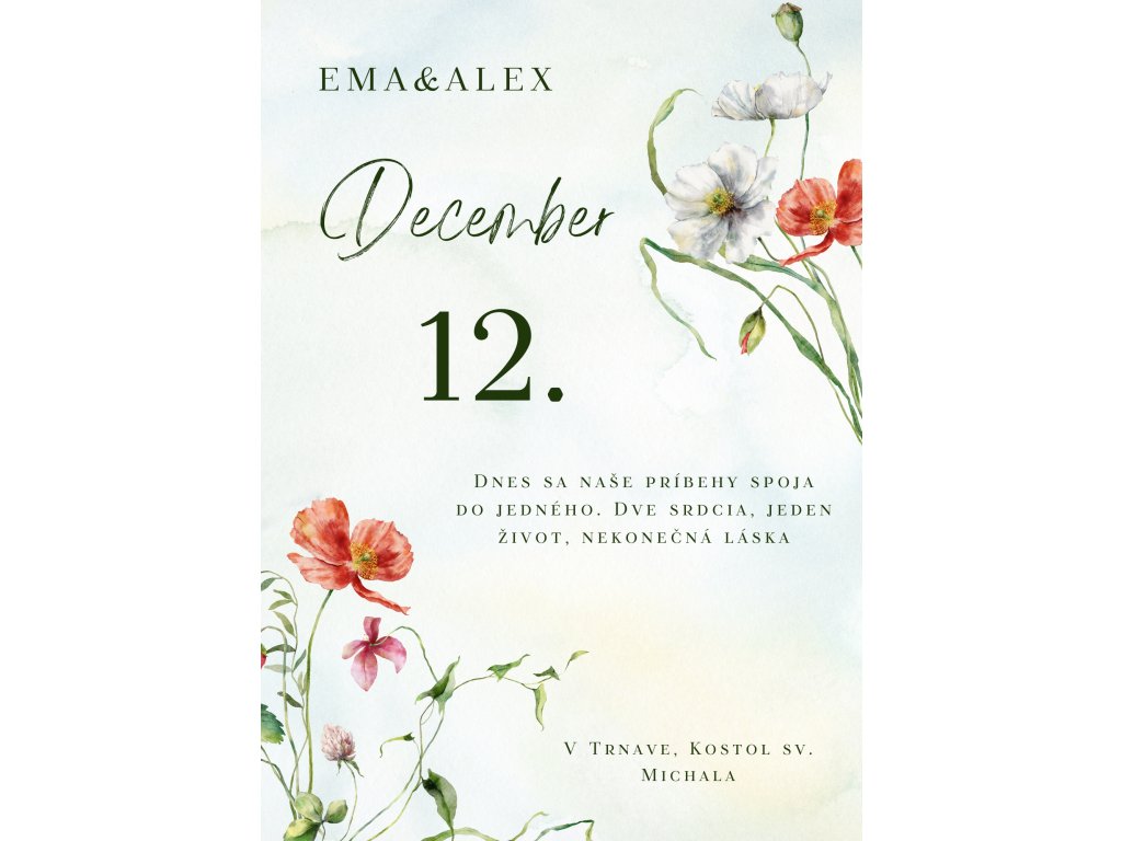 Toto oznámenie pôsobí ako prechádzka rozkvitnutou lúkou pod letnou oblohou. Dve dominantné lúčne rastliny po bokoch oznamka rámujú text s prirodzenou eleganciou a ľahkosťou. Jemné modré pozadie pripomína jasný denný oblak bez mráčika a navodzuje pokojnú atmosféru. Ideálne pre páry, ktoré si chcú svoj veľký deň spojiť s krásou prírody a voľnosti.