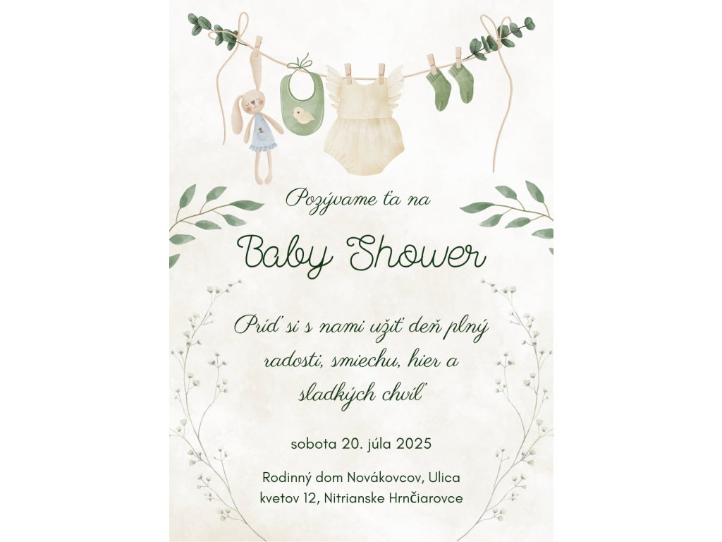Táto nežná Baby Shower pozvánka v prírodnom štýle vás okamžite očarí svojou jemnosťou a útulnou atmosférou. Na šnúre sa hojdajú roztomilé detské drobnosti – overal, ponožky, podbradník a plyšový zajačik – obklopené sviežimi zelenými lístkami a drobnými kvietkami. Svetlý podklad s akvarelovým nádychom vytvára pocit pohody a tepla, vďaka čomu je ideálna na pozvanie blízkych k oslave radostného očakávania bábätka.